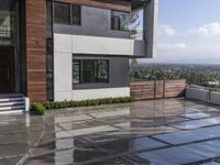 A modern architectural masterpiece in Los Angeles, California. The sleek facade of this residential villa glistens with a wet surface. Clouds reflect on the glass walls, creating a stunning dawn view.