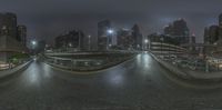 A stunning night view of the Los Angeles cityscape, with illuminated skyscrapers and modern architecture. The city lights reflect on the wet road, creating a captivating atmosphere. The downtown area is highlighted by the towering skyline.