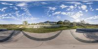 A modern architecture home in California, surrounded by lush green grass and trees. The open space and clear sky create a serene landscape. The residential area features a unique race track and a botanical garden.