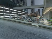 A night-time view of Los Angeles, California. The cityscape is illuminated by street lights and the glow of modern architecture. A bridge spans the road, blending into the metropolitan skyline.