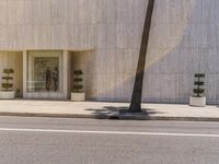 A person walks along the sidewalk in the bustling business district of Los Angeles, California. Modern architecture lines the streets, creating a symmetrical urban landscape. The tree provides shade against the backdrop of the city's iconic buildings.