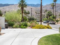 A modern residential home in Palm Springs, California. The sleek architecture stands out against the lush green landscape. A concrete driveway leads to the entryway. Palm trees and bush add to the serene suburban setting under the clear sky of Sonora Desert.