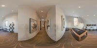 Spacious living room in a modern California villa. The room features a pool table and a vibrant painting on the wall. Stylish furniture and a yellow color scheme create a warm and inviting atmosphere.