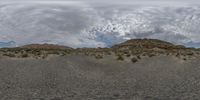 A rugged and dry landscape in California, with mountains in the foreground and a large field featuring a red fire hydrant. The grey sky adds to the gloomy atmosphere of the scene.