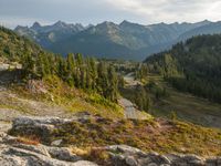 A person on a bike rides down a mountain trail in California, surrounded by a stunning natural landscape. The mountains and cliffs of the highlands provide a picturesque backdrop, while the grey sky complements the wilderness. An adventurous day in the USA.