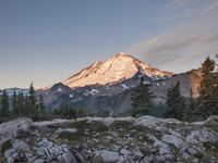 the mountain is covered with snow and has snow capped peak behind it at sunset as seen from a distance