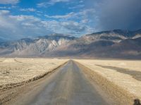 This is an image of a rugged road in California, USA. The road surface appears to be made of asphalt and dirt, surrounded by mountains and rocky hills. The sky is filled with clouds, indicating a cloudy day. The landscape showcases the natural environment of the desert with gravel and tree cover. The photo captures the serenity and vastness of the California landscape. This photo represents a picturesque view of a road in the wilderness.