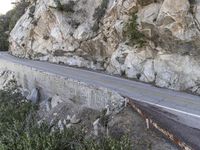 This is an image of a mountainous landscape in California, USA. The photo was taken at dawn, showing a road winding through the rugged terrain. The asphalt road is elevated, following the natural contours of the mountains. Guard rails and Armco barriers protect drivers from the cliffs and rock walls along the thoroughfare. The rock formations and outcrops showcase the unique geology of the area, including fault formations and bedrock. This photo captures the beauty of California's nature and the challenging infrastructure required to traverse its high mountain passes.