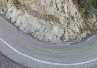 the road passes by an intricately curved mountain side curve, and one motorcycle is passing