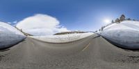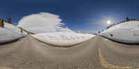 A snow-covered road winds through the mountainous landscape of Mammoth Lake, California. The straight path leads to a breathtaking view of the snow-capped mountain range. The sunrise casts a warm glow over the frozen scenery.