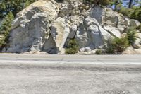 This is an image of a vibrant landscape in California, USA. The photo captures a rural road winding through the scenic terrain, surrounded by lush green trees and towering mountains. The rock formations and outcrops showcase the unique geology of the region. In the distance, you can see the profile of a cliff and a clear sky overhead. This picture represents the beauty of nature and the diverse landscape found in California's national parks. It is a perfect representation of a sunny day in California.