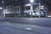 A view of a modern office building in downtown Los Angeles, California. The urban landscape is illuminated by street lights, creating a vibrant nighttime scene. The city's business district comes alive with the glow of artificial light.