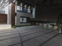 A modern architecture home in Los Angeles, California, illuminated by artificial light at night. The concrete tile driveway, high-floor villa, and open space create a sleek and contemporary design.