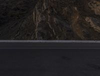 A night drive along California's iconic Pacific Coast Highway. The road winds along the coastal line, framed by towering mountains. The dark rock formations and black rock walls add to the dramatic geology of the landscape.