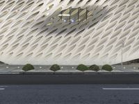 This image captures the vibrant city of Los Angeles, California at night. The modern architecture of the cityscape is highlighted by the futuristic designs and patterns of the buildings. The streets are lined with road surfaces made of asphalt, illuminated by streetlights casting artificial light on the thoroughfares. The structures feature unique facades, windows, and rooftops, showcasing the diverse architectural styles of the city. One standout is the Brutalist architecture of the headquarters building, with its mesh metal profile standing out against the night sky. This photo depicts the urban design and infrastructure of Los Angeles.