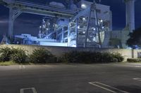 A nighttime view of Los Angeles, California. The city's architecture is illuminated by street lights and artificial light. The metropolitan area is dotted with buildings, parking lots, and factories. Dark clouds hang over the urban landscape.