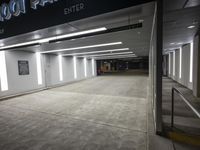 The entrance of an empty parking garage in Los Angeles, California. Neon lights illuminate the darkened space as signs guide the way. The urban architecture and concrete surface create a dramatic metropolitan night scene.