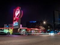 A dark, suburban street in California illuminated by artificial light. Neon signs on buildings and motion blur of passing cars create a lively atmosphere. An ideal spot to eat out or explore the city at midnight.