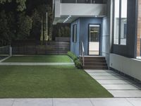 an outdoor lawn at night with lighting and artificial grass on the walkways and steps to the side