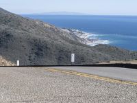 a motorcycle going down a hill in the ocean next to the road and a sign