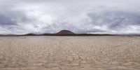 A vast open space in California, with a sandy field stretching towards the horizon. A mountain stands majestically in the background, under a clear blue sky. A serene and dramatic natural environment.