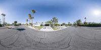 A view of a residential street in Palm Springs, California. Modern architecture and low-rise homes line the road, with palm trees and a clear sky in the background. Parking spaces and a carport are visible, showcasing the suburban landscape of the area.