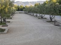 A lush and green courtyard in Los Angeles, California. The elevated walkway provides a high viewpoint, offering a straight down view of the road surface. Several trees grow amidst the concrete pavers, surrounded by grass and shrubs.