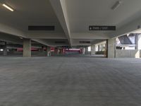a parking garage with cement floors and large ceilings with signs at one end of the parking space