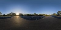 a circular picture of a parking lot and some trees in the sun and with a blue sky