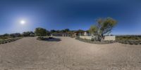 A spacious modern house in Los Angeles, California. Situated on a dirt lot with no grass, surrounded by trees. The open space and clear sky create a serene atmosphere. A perfect blend of nature and modern architecture.