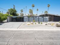 A mid-century modern home in Palm Springs, California. The open driveway leads to garages and carports, reflecting the suburban architecture. Clear skies and the Sonora Desert create a picturesque backdrop.