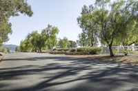 This is an image of a residential area in Ojai, California, USA. The architecture of the houses and the road surface can be seen. The asphalt road is surrounded by well-maintained grass and trees, creating a green and serene neighborhood. The image captures the beauty of the residential estate and the lush vegetation in the area. This photo can be used as a backplate for showcasing real estate properties or as a representation of a peaceful neighborhood in Ojai.