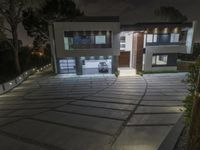 Modern architecture in Los Angeles, California. Two illuminated houses stand in a residential area at night, surrounded by concrete surfaces and open spaces. The artificial lights create a striking contrast against the dark sky.