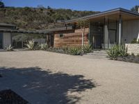 This is an image of a modern residential home in Los Angeles, California. The house is located in a suburban area, surrounded by trees and vegetation. The architecture of the home features a modern facade, with a roof and entrance door. The property is situated on a land lot, with a driveway and gravel surface leading up to the house. The open space and clear sky create a pleasant atmosphere. This photo represents a typical day in the residential areas of Los Angeles.