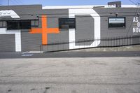 a gray building with orange crosses painted on it's side is shown here and has the word asl