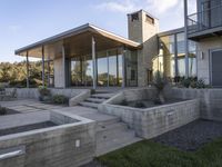 A modern residential building in Los Angeles, California. The house features a sleek concrete facade with a wood roof and a spacious backyard garden. The interior design showcases a wood floor and a terrace with a clear sky view.