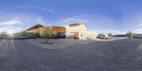 A modern architecture villa in Los Angeles, California. The low-profile house is surrounded by open space and features a unique facade. Clear skies and a rural backdrop create a serene atmosphere.