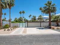 This is an image of a modern residential home in Palm Springs, California. The house features straight lines and modern architecture, with a clear sky as the backdrop. The asphalt road leads to the house, and a driveway and parking garage can be seen to the side. Surrounding the house are palm trees, typical of the Sonora Desert landscape. This photo captures a typical day in Palm Springs, showcasing the unique combination of modern architecture and natural surroundings.