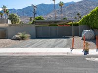 A modern residential villa in Palm Springs, California. The mid-century home features sleek architecture with a clear sky backdrop. The palm trees and mountain landscape add to the suburban charm of the driveway entry.
