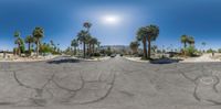 A panoramic view of a straight road in Palm Springs, California. Modern architecture homes line the residential area with palm trees and clear skies. The low entry driveway leads to a mid-century villa. An open space with a stop sign creates a suburban atmosphere in the Sonora Desert.