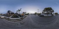 A fisheye view of a residential street in Los Angeles, California. Modern architecture lines the road, with vehicles at a stop sign. The cityscape blends with the urban design and lush vegetation.