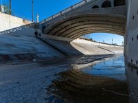 a water channel under an overpass and under construction with no water on it or one person in the way