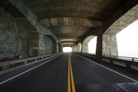 An empty road in Big Sur, California, passing under a stunning bridge with arches and columns. The straight road leads to a connection point, marked by yellow dividing lines. The architecture of the bridge enhances the scenic beauty of the paved road.