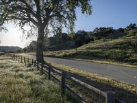 A picturesque road in California, winding through grassy hills and shaded by trees. The wooden fence adds to the rustic charm. The tree-lined dirt path leads to serene nature. A perfect day for a recreational drive.