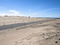 Elevated view of a coastal road in California, surrounded by the natural landscape. Clear sky and horizon meet the high ocean waves, creating a picturesque scene. Sand dunes line the beach, adding to the beauty of the desert coast.