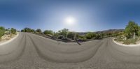 A long empty road in Los Angeles, California, stretches towards the mountains. The clear sky and bright sun create a sunny and open space. The fisheye lens captures the road's curve and the hard shadows cast by the mountains.