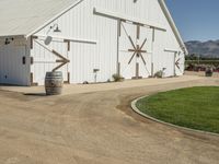 A picturesque rural landscape in California, featuring a large white barn surrounded by lush green grass. Two wine barrels add charm to the scene. The clear sky highlights the beauty of this agricultural property.