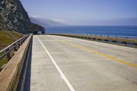 This is a scenic view of a road along the coastal cliffs of Big Sur, California, USA. The road surface is made of concrete and asphalt, with a guard rail running alongside. The landscape features mountains in the background and the vast expanse of the ocean and sea below. Clouds can be seen in the horizon, casting shadows on the road. This image captures the essence of a road trip through the picturesque terrain of Big Sur, with the highway and yellow road markings guiding vehicles on their journey.