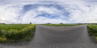 A scenic drive through California's countryside, capturing the beauty of wildflowers in full bloom. The fish-eye lens creates a unique perspective, highlighting the vibrant colors against a clear sky. A picturesque journey through nature's lush landscape.