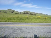 This stock photo captures a scenic road in California, USA. The asphalt road winds through a breathtaking landscape of mountains, grassy fields, and lush vegetation. The image was taken on a sunny day, showcasing the natural beauty of the highlands. Clouds can be seen floating in the sky, adding to the overall picturesque view. This photograph represents the peaceful and recreational opportunities offered by the Californian wilderness. The green prairies and agricultural fields blend seamlessly with the elevated mountain landforms, creating a harmonious and serene natural environment. The grass surface partially covers the road, giving it a quaint and inviting feel. This picture perfectly captures the beauty of California's countryside and is an ideal representation of the state's diverse and stunning landscapes.